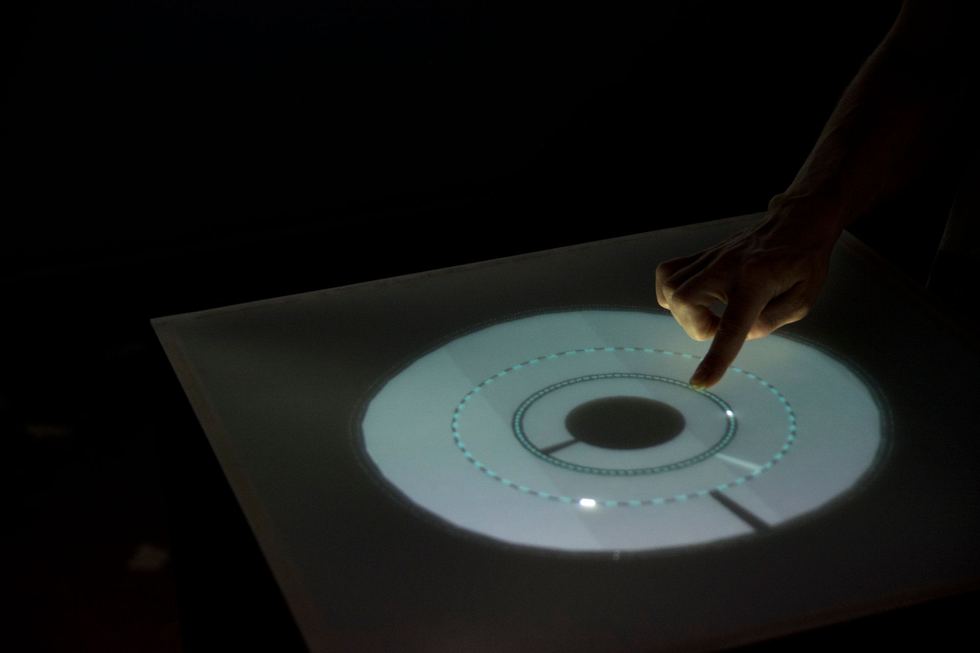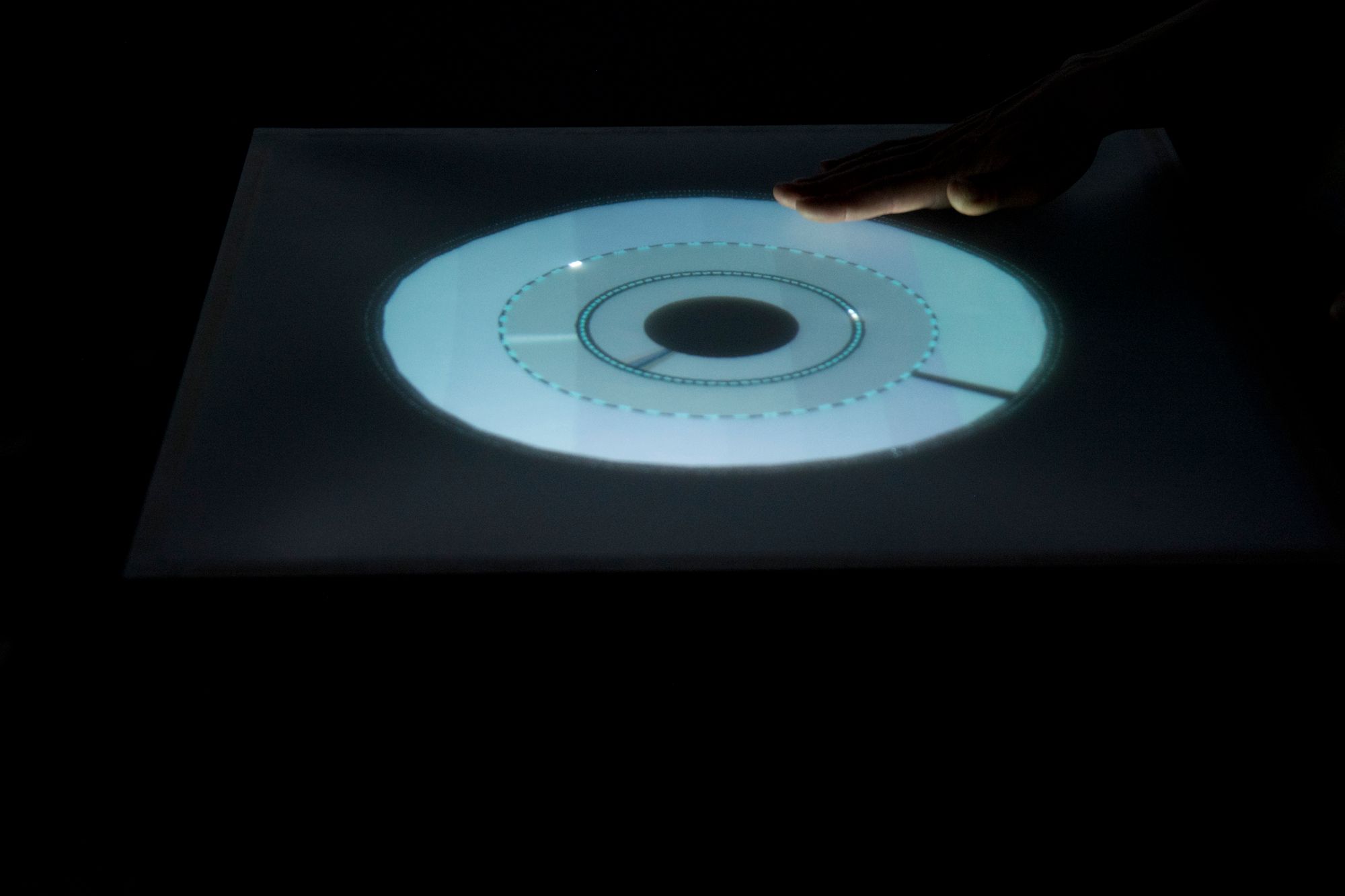 Inside the custom built touch reactive interface, a real-time simulation software is situated, making use of various technologies and protocols all routed up in VVVV in conjunction with custom programmed audio engine running in Usine.