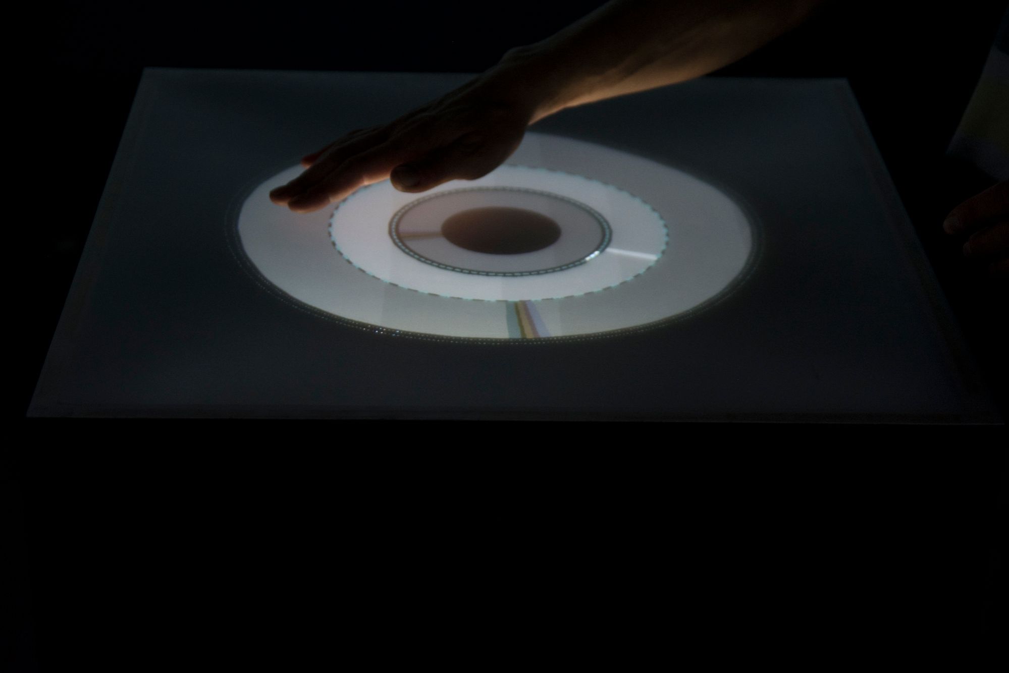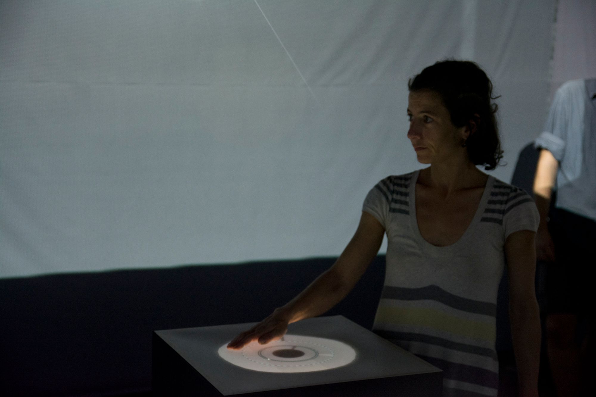 Centrally located, a monolith shaped physical object enables the audience to have complete control over their surrounding using said multi-touch interaction device. It invites participation of the audience, and once it receives feedback from an audience member, the whole space awakes with activity, provokes further experimentation by the observer. Their fingertips now become the environment, and the observer becomes a conductor of his own audio visual experience.