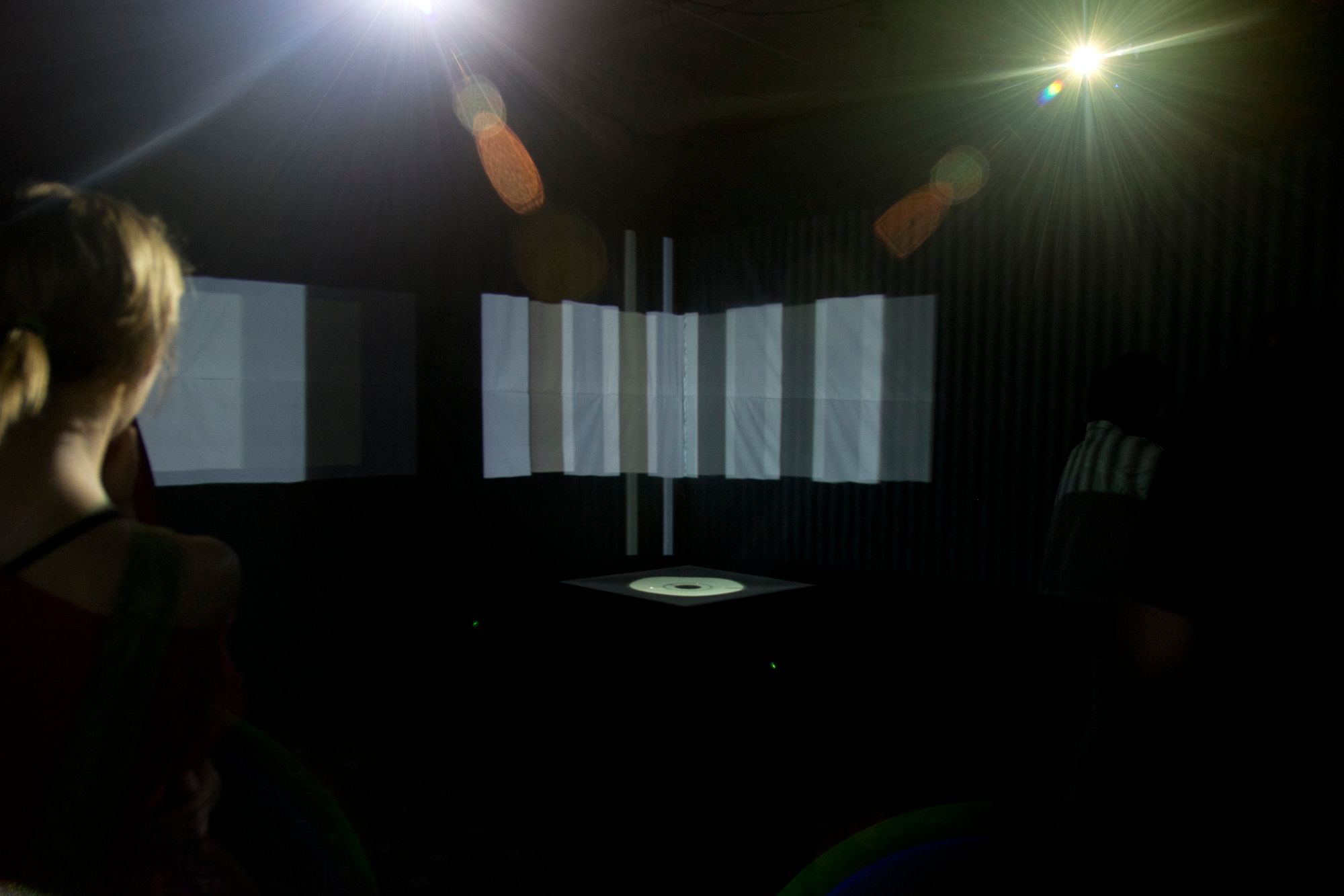 The piece uses a quadrophonic audio engine and an edge-blending multichannel projection transforming the room into an immersive audiovisual experience where converged mashups of abstract geometric objects and micro sound textures are emitted at high intensity and frequency, while they are also constantly seamlessly coordinated in a coherent whole.